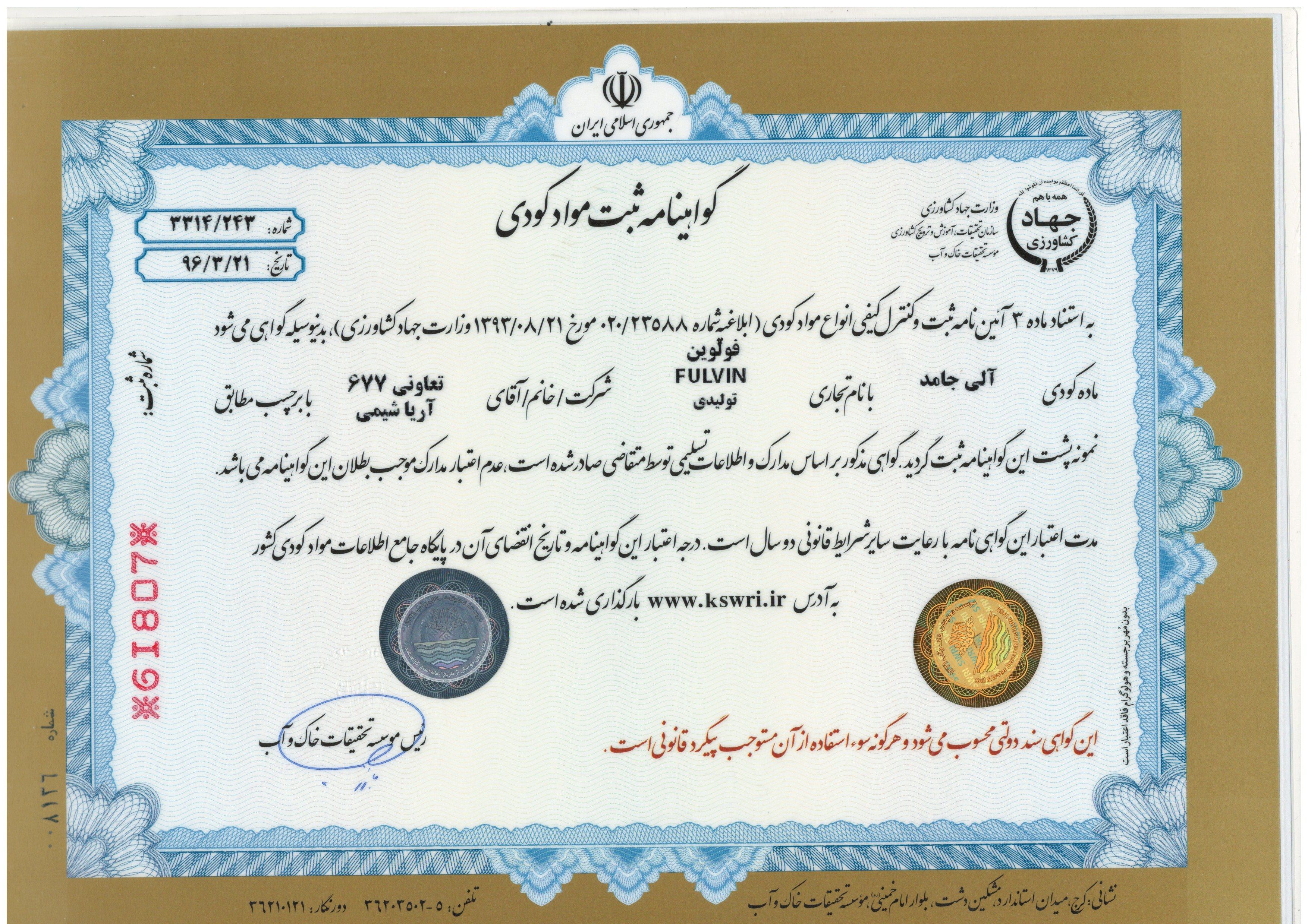 فولوین حاوی عناصر ماکرو، ریزمغذی و اسید فولویک می باشد. اسید فولویک دارای مزایای فراوانی برای خاک و گیاه بوده و به علت داشتن وزن مولکولی پایین به راحتی می تواند عناصر غذایی را جابجا نموده و تا چندین برابر وزن خود را به داخل سلول حمل کند. فولویک اسید کلات کننده طبیعی عناصر غذایی از قبیل آهن، روی، منگنز و ... می باشد و مانع از تثبیت و شسته شدن فسفر، نیتروژن و عناصر میکرو شده و به طور موثری این عناصر را در اختیار گیاه قرار می دهد.
