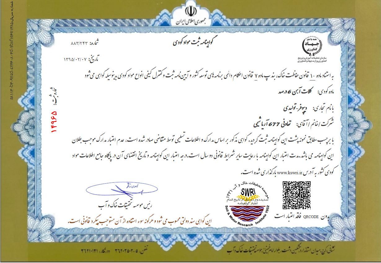 کود دیپوفر، حاوی 6 درصد آهن کلات شده و قابل جذب برای گیاه است. این محصول برای مصرف خاکی و کود آبیاری مناسب می باشد. کمبود فیزیولوژیک آهن به دلیل pH بالا، وجود کربنات کلسیم در خاک و عدم توانایی جذب کامل آهن توسط ریشه در گیاه روی می دهد. این ترکیب به دلیل پایداری در pH های قلیایی سبب افزایش جذب و تحرک عنصر آهن توسط سیستم ریشه ای گیاه می شود.