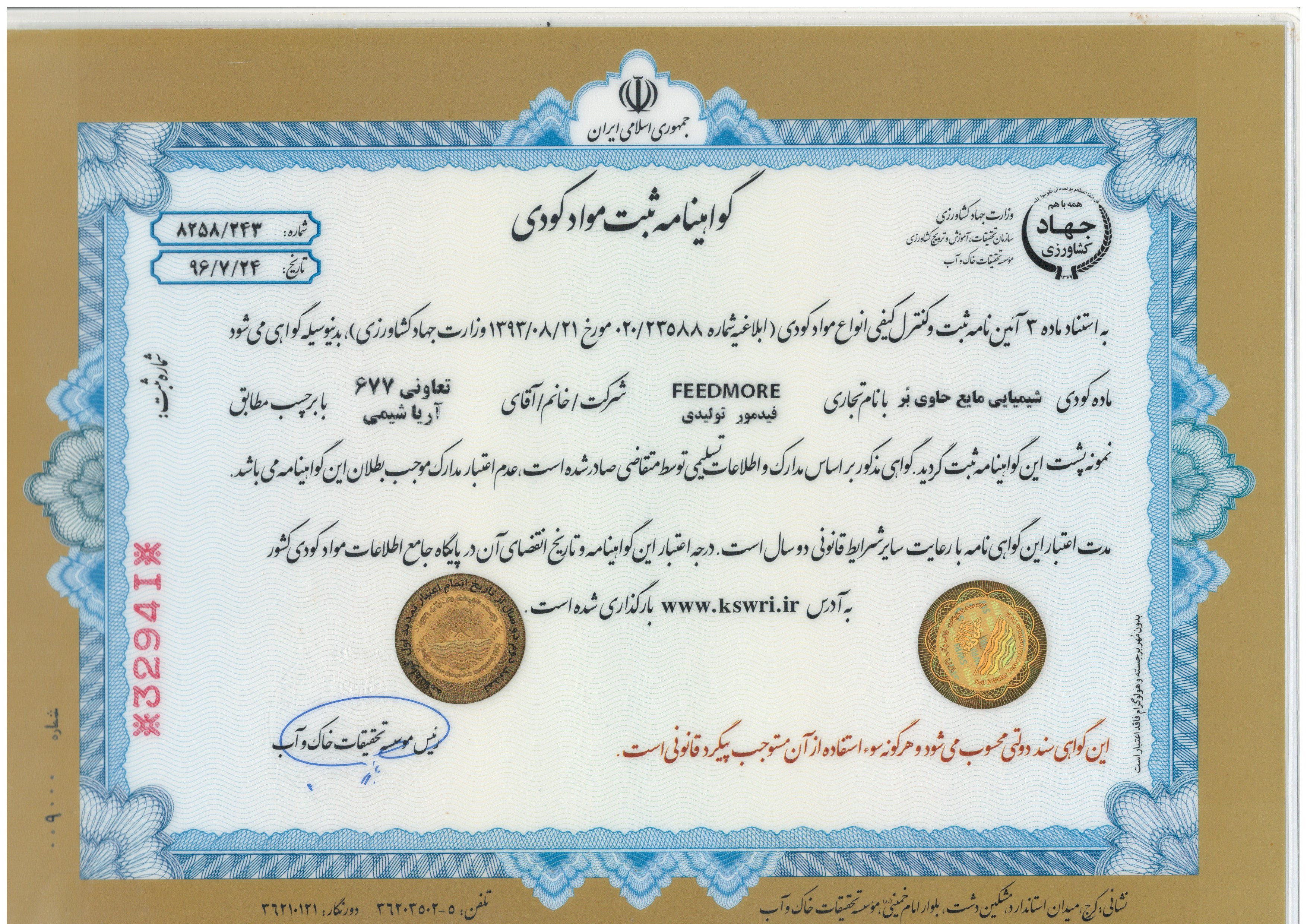 کود مایع فیدمور حاوی درصد بالایی از عنصر بُر بوده که به سرعت توسط گیاه جذب می گردد. حضور اتانول آمین در فرمولاسیون این کود میزان جذب بُر از طریق برگ را افزایش داده و نیز سبب تسهیل در انتقال این عنصر در درون بافت های گیاه می شود. بُر یکی از عناصر ریزمغذی است که در تشکیل جوانه گل، تشکیل گرده و رشد لوله گرده نقش اساسی داشته و از ریزش گل، (به علت بارور نشدن گل) جلوگیری و در نتیجه باعث افزایش درصد تشکیل میوه می شود. علاوه بر این، بُر در انتقال قندها، تقسیم و توسعه سلولی، متابولیسم هورمون اکسین، سنتز اسیدهای نوکلئیک و به طور غیرمستقیم تولید پروتئین و همچنین جذب کلسیم دخالت دارد.